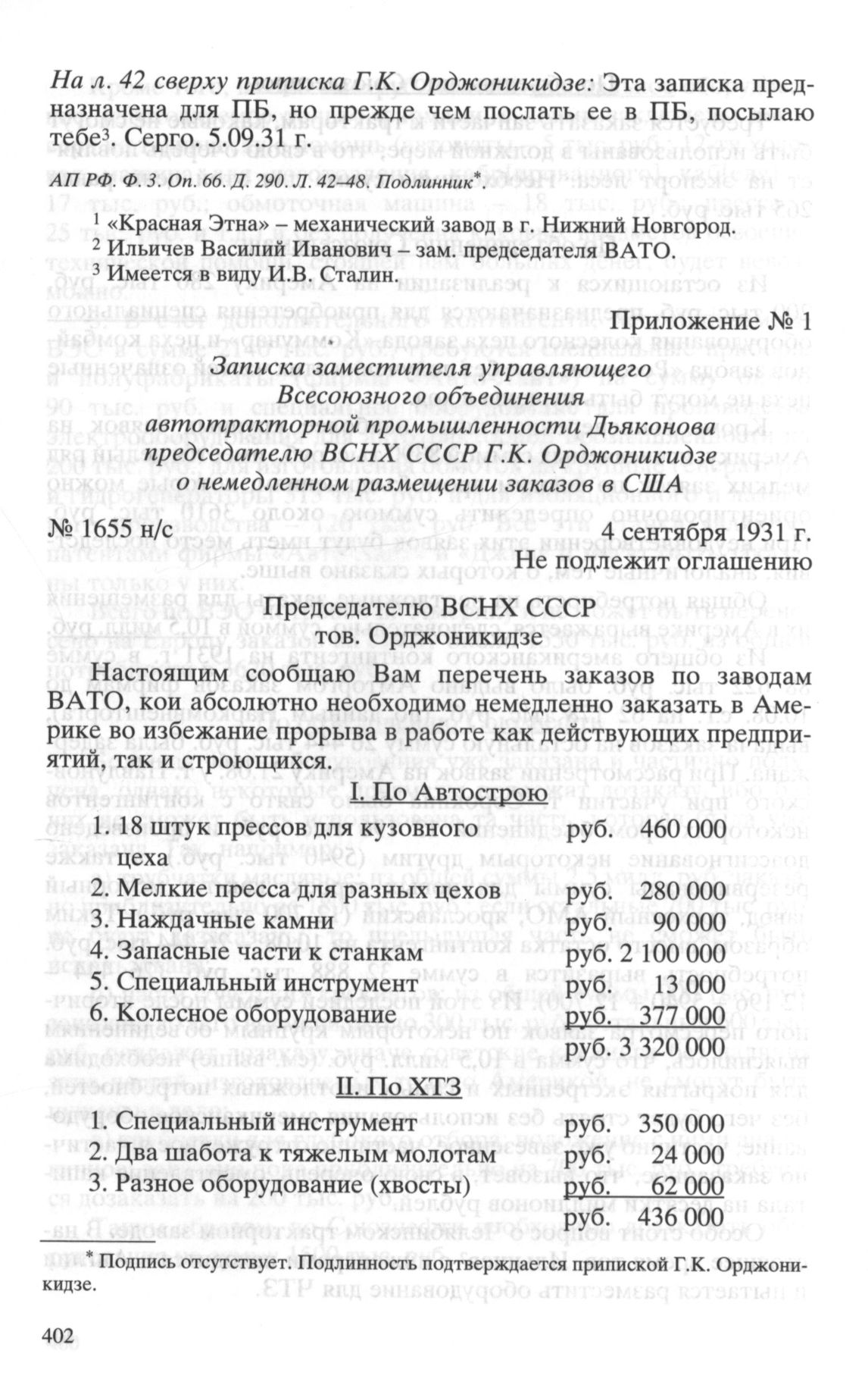 Приложение № 1. Записка заместителя управляющего Всесоюзного объединения автотракторной промышленности Дьяконова председателю ВСНХ СССР Г.К. Орджоникидзе о немедленном размещении заказов в США. 4 сентября 1931 г.