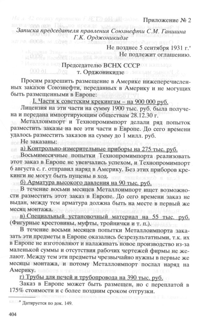 Приложение № 2. Записка председателя правления Союзнефти С.М. Ганшина Г.К. Орджоникидзе. Не позднее 5 сентября 1931 г.