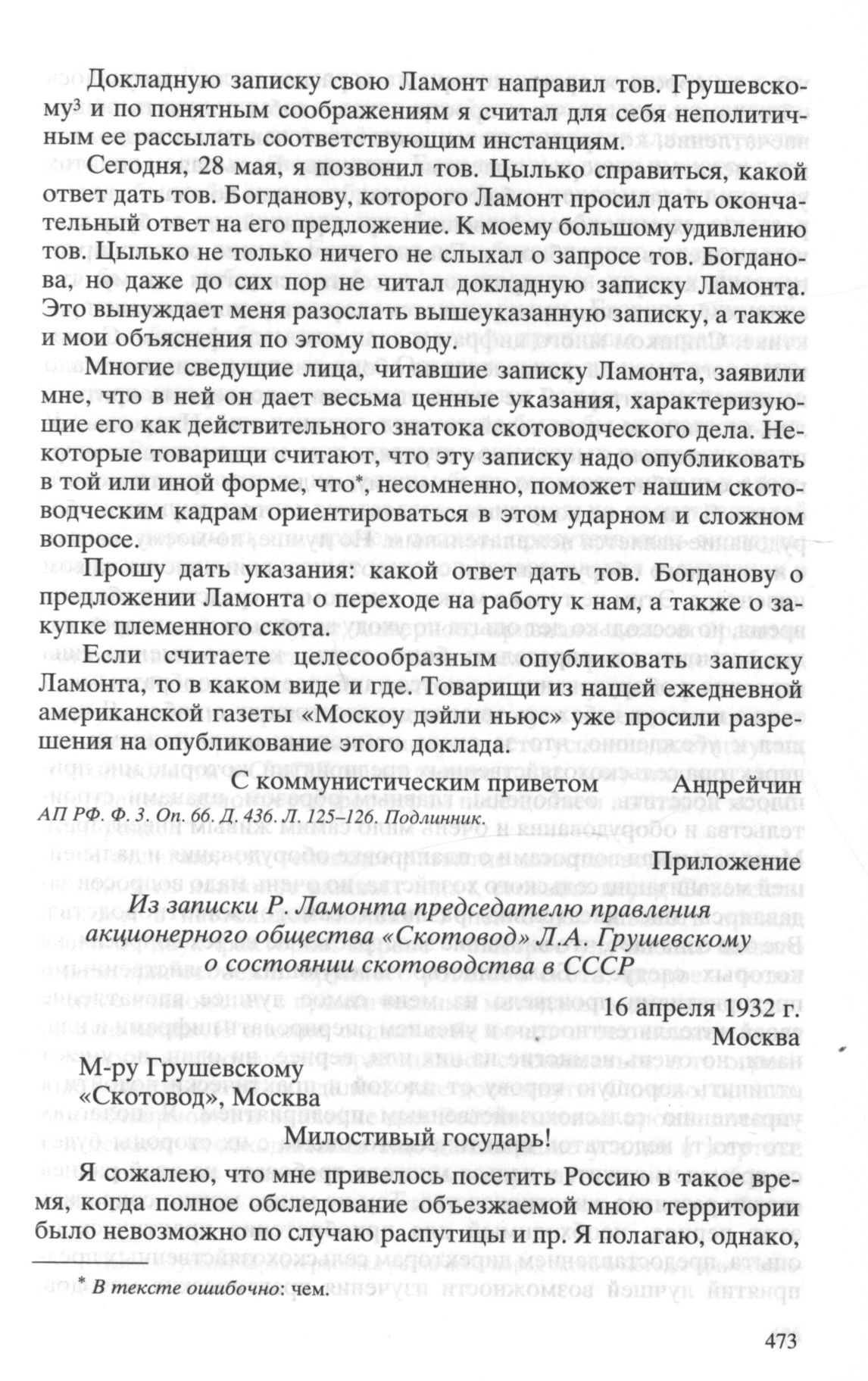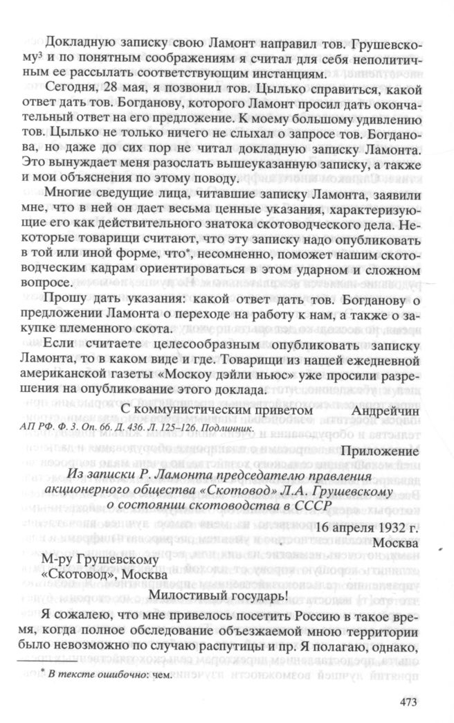 Приложение. Из записки Р. Ламонта председателю правления акционерного общества «Скотовод» Л.А. Грушевскому о состоянии скотоводства в СССР. 16 апреля 1932 г.