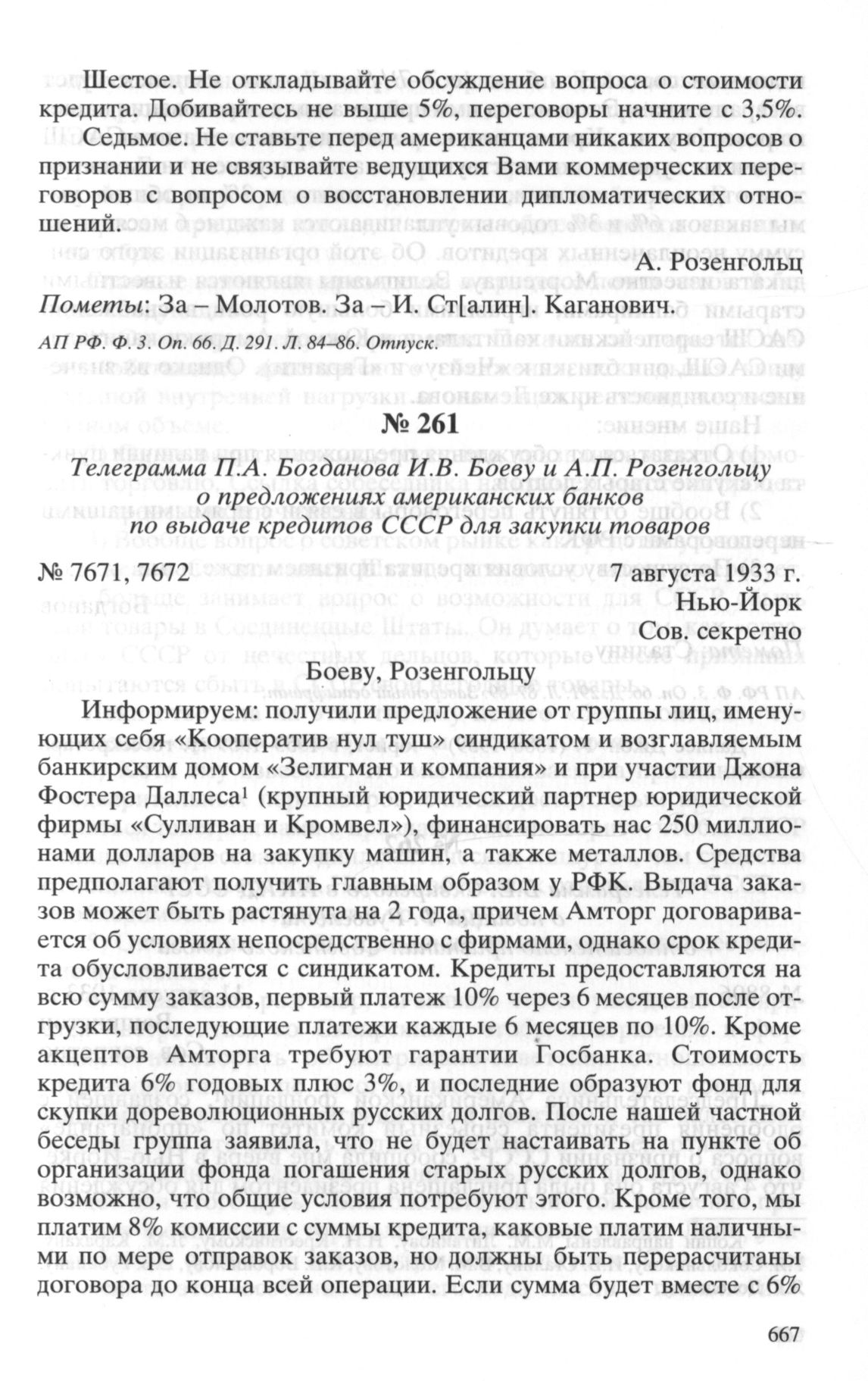 Телеграмма П.А. Богданова И.В. Боеву и А.П. Розенгольцу о предложениях американских банков по выдаче кредитов СССР для закупки товаров. 7 августа 1933 г. // АП РФ. Ф. 3. Oп. 66. Д. 291. Л. 87-89. Заверенный дешифрант.
