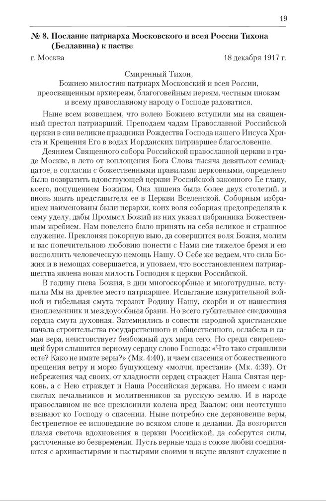 Послание патриарха Московского и всея России Тихона (Беллавина) к пастве. 18 декабря 1917 г. // Церковные ведомости. 1918. № 1. Акты святейшего патриарха Тихона и позднейшие документы о преемстве высшей церковной власти. 1917-1943 гг. Сб.: В 2 ч. / сост. М.Е. Губонин. М., 1994. С. 70-71.