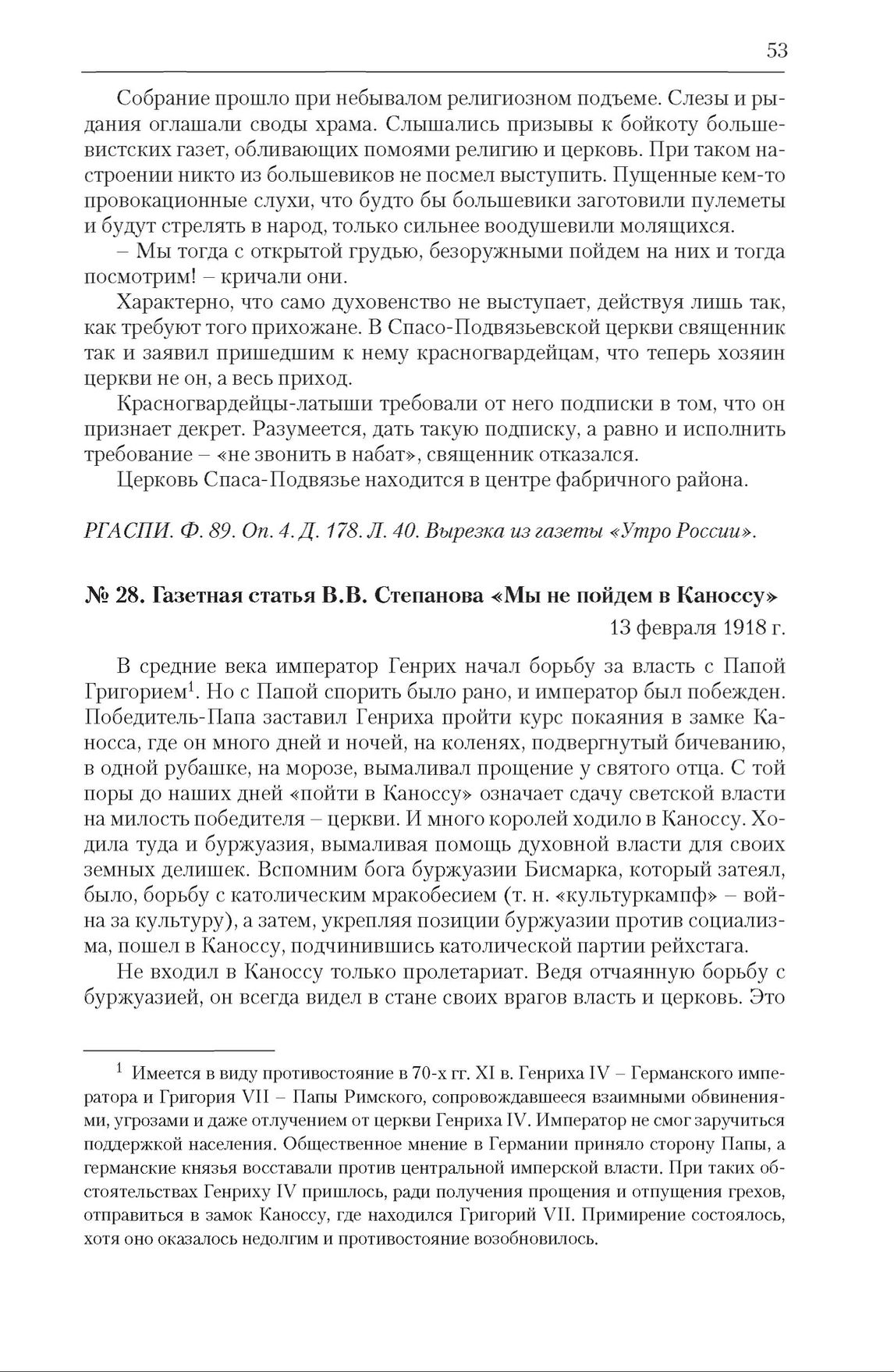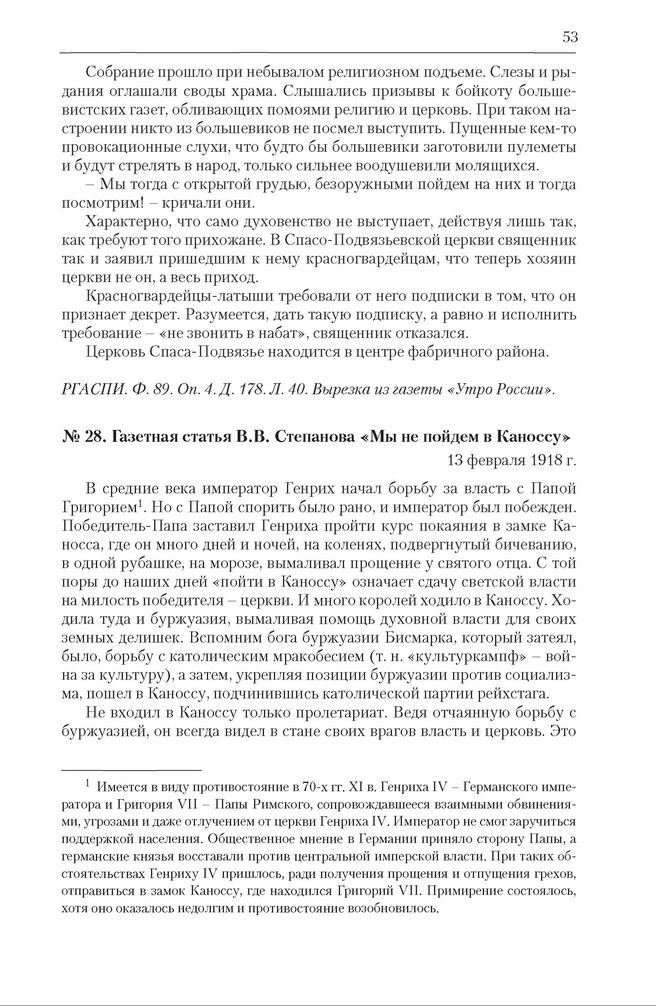 Газетная статья В.В. Степанова «Мы не пойдем в Каноссу». 13 февраля 1918 г. // Правда. 1918. 13 февраля.