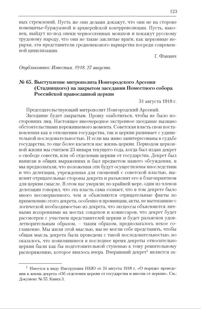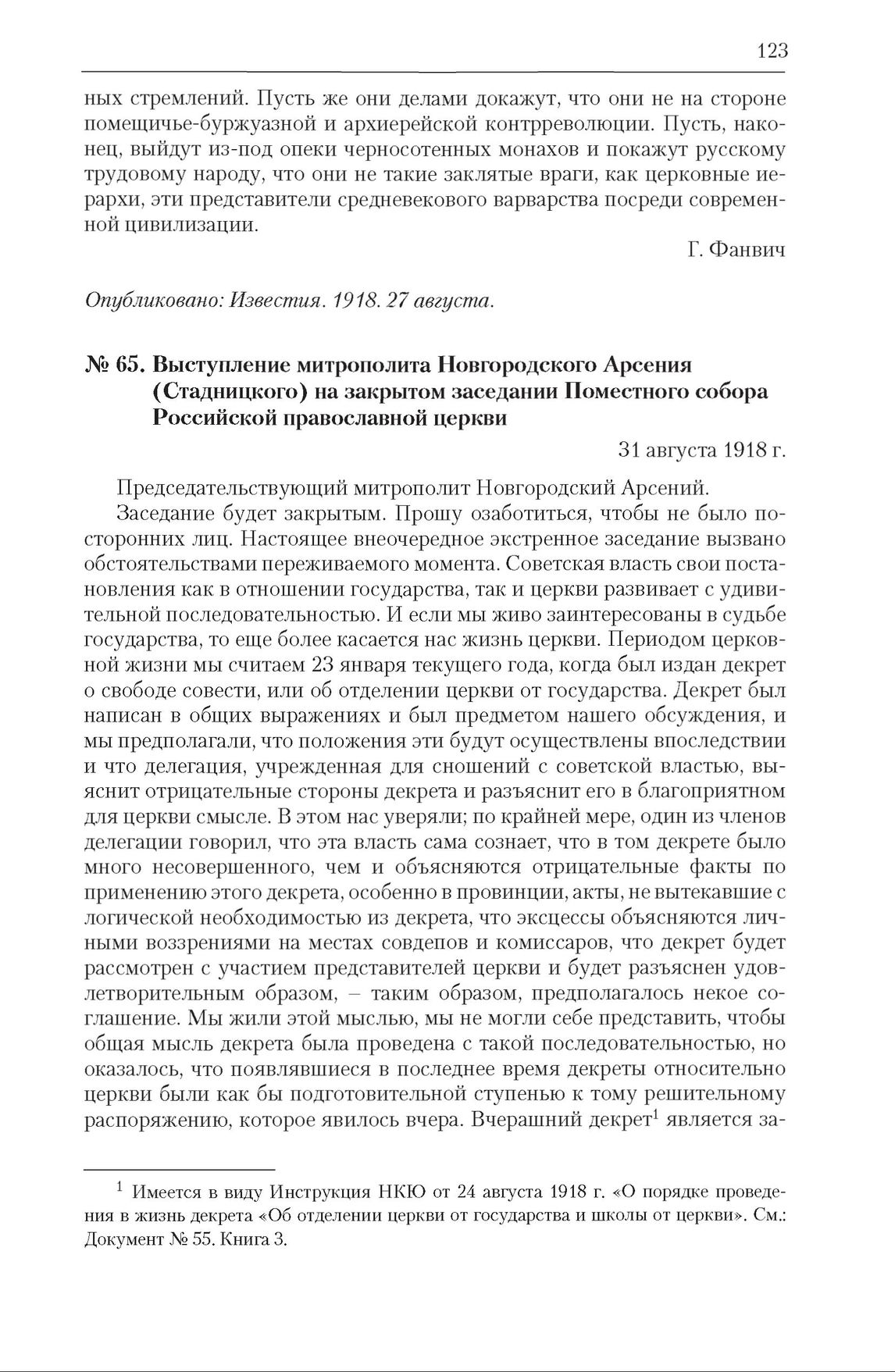 Выступление митрополита Новгородского Арсения (Стадницкого) на закрытом заседании Поместного собора Российской православной церкви. 31 августа 1918 г. // ГА РФ. Ф. Р-3431. Оп. 1. Д. 156. Л. 71-75. Копия. Машинописный текст. «Приспело время подвига…»: Документы Священного собора православной Российской церкви 1917-1918 гг. о начале гонений на церковь» / сост. Н.А. Кривошеева. М., 2012. С. 368-373.
