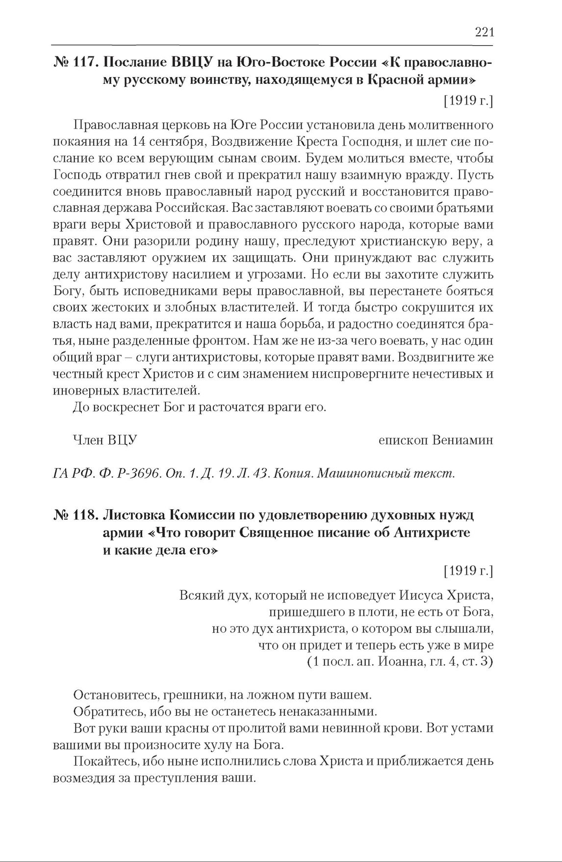 Послание ВВЦУ на Юго-Востоке России «К православному русскому воинству, находящемуся в Красной армии». [1919 г.] // ГА РФ. Ф. Р-3696. Оп. 1. Д. 19. Л. 43. Копия. Машинописный текст.