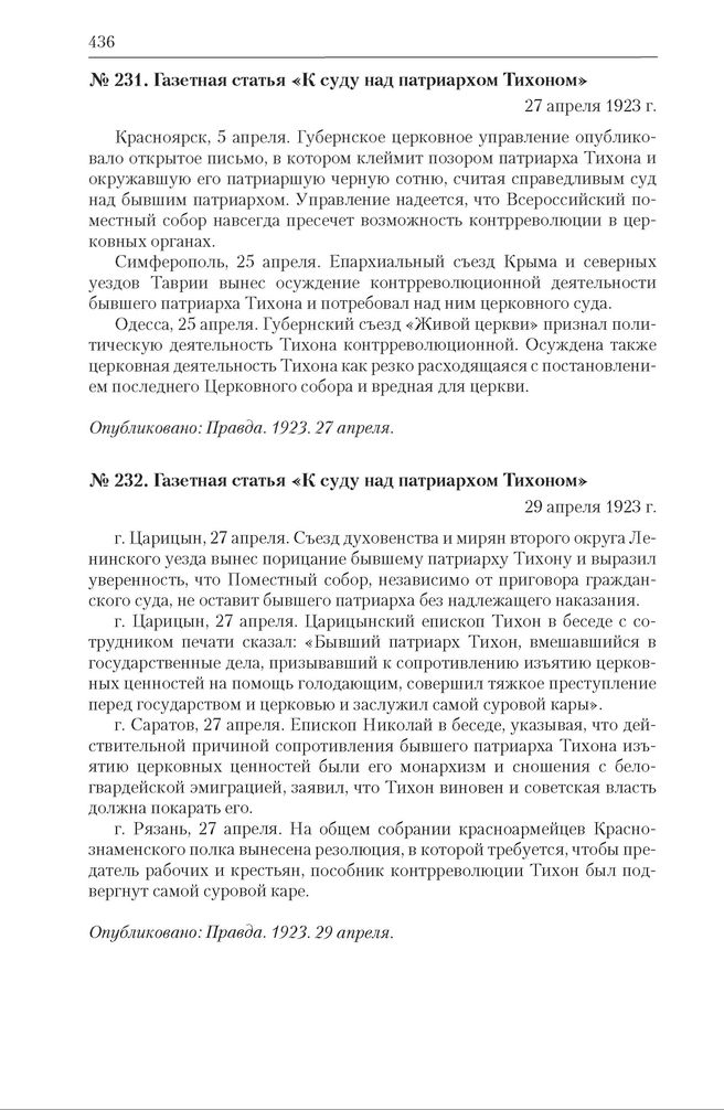 Газетная статья «К суду над патриархом Тихоном». 27 апреля 1923 г. // Правда. 1923. 27 апреля.