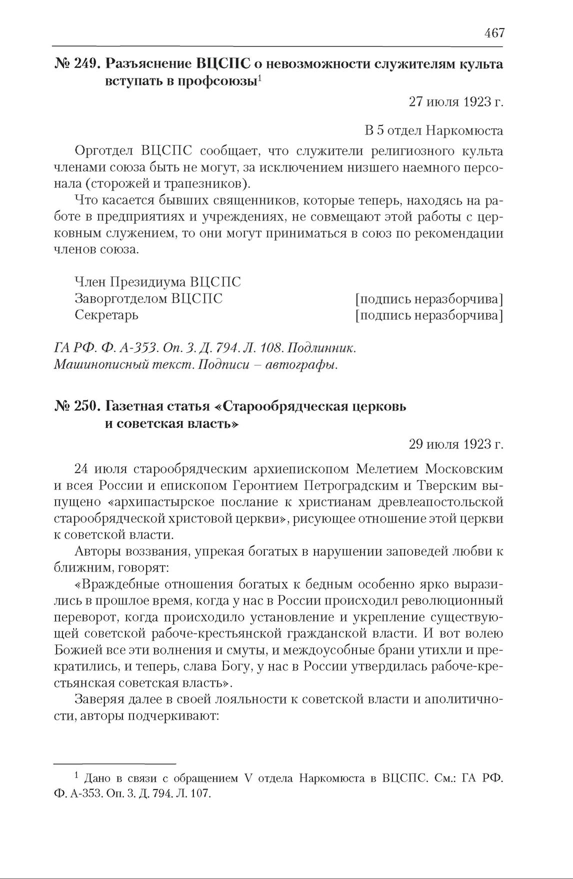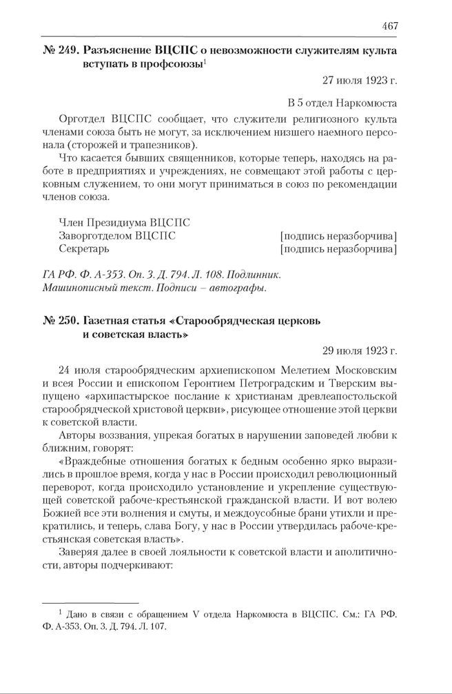 Газетная статья «Старообрядческая церковь и советская власть». 29 июля 1923 г. // Правда. 1923. 29 июля.