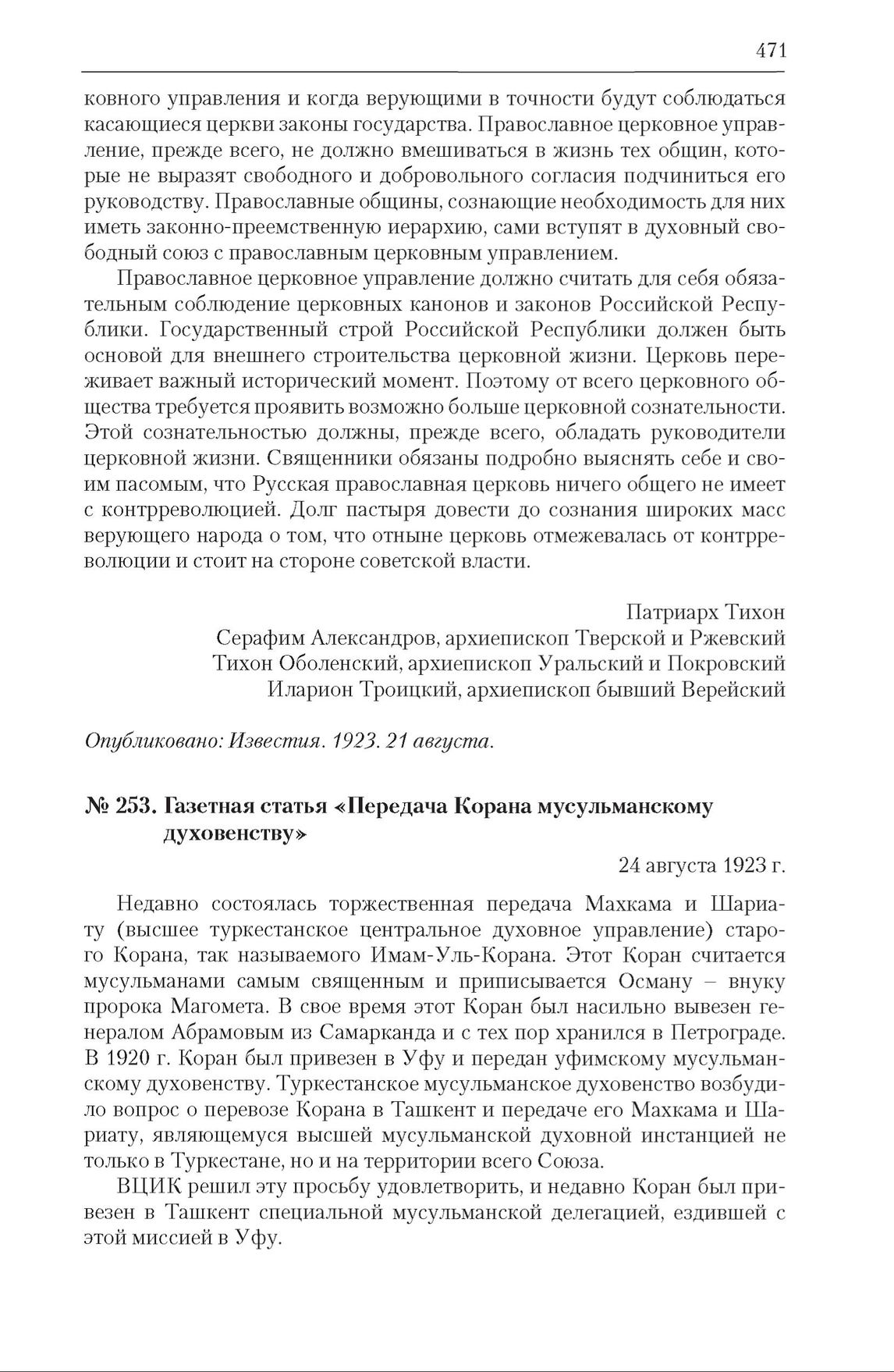 Газетная статья «Передача Корана мусульманскому духовенству». 24 августа 1923 г. // Правда. 1923. 24 августа.