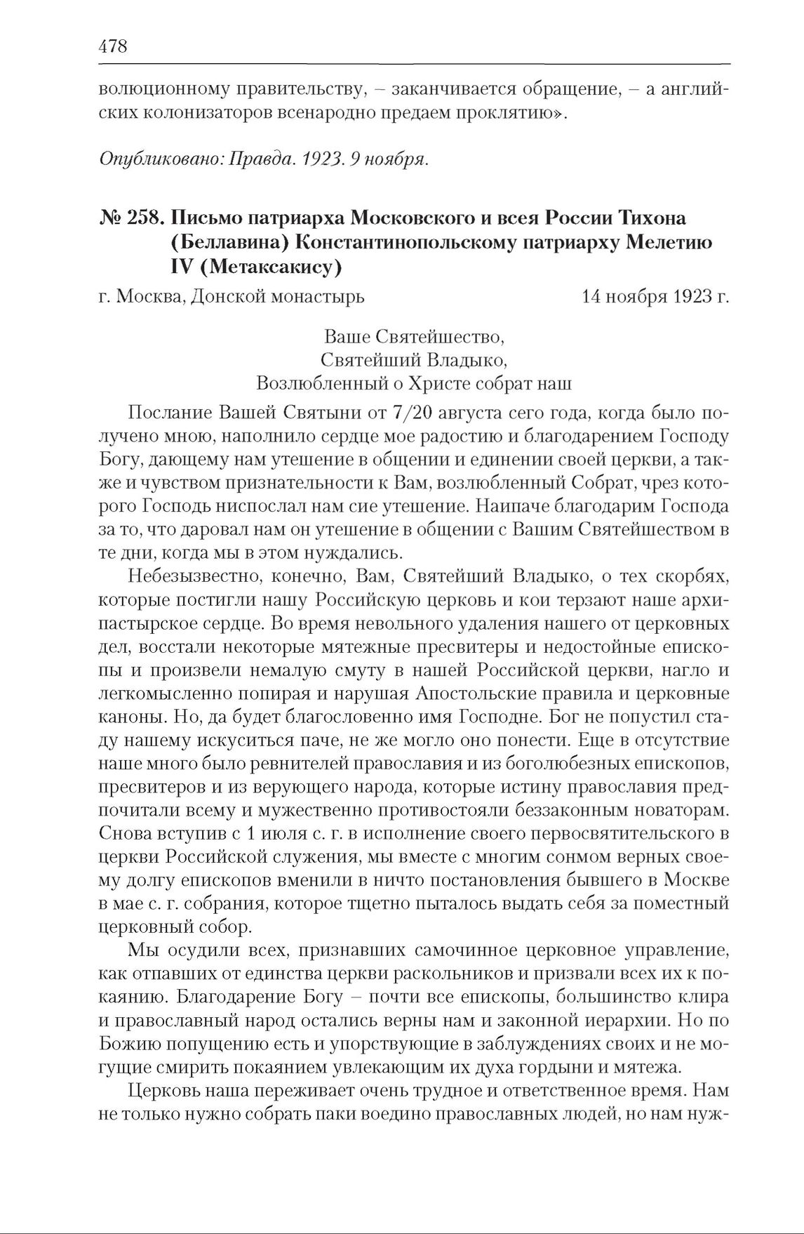 Письмо патриарха Московского и всея России Тихона (Беллавина) Константинопольскому патриарху Мелетию IV (Метаксакису). 14 ноября 1923 г.