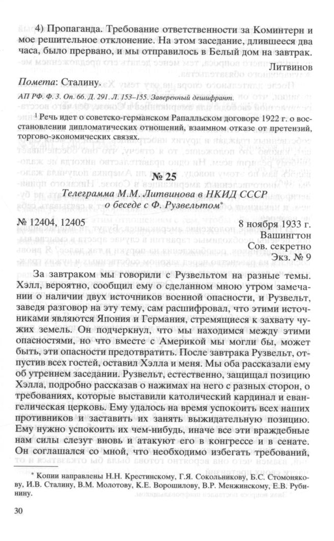 Телеграмма М.М. Литвинова в НКИД СССР о беседе с Ф. Рузвельтом. 8 ноября 1933 г. // АП РФ. Ф. 3. Oп. 66. Д. 291. Л. 156-157. Заверенный дешифрант.