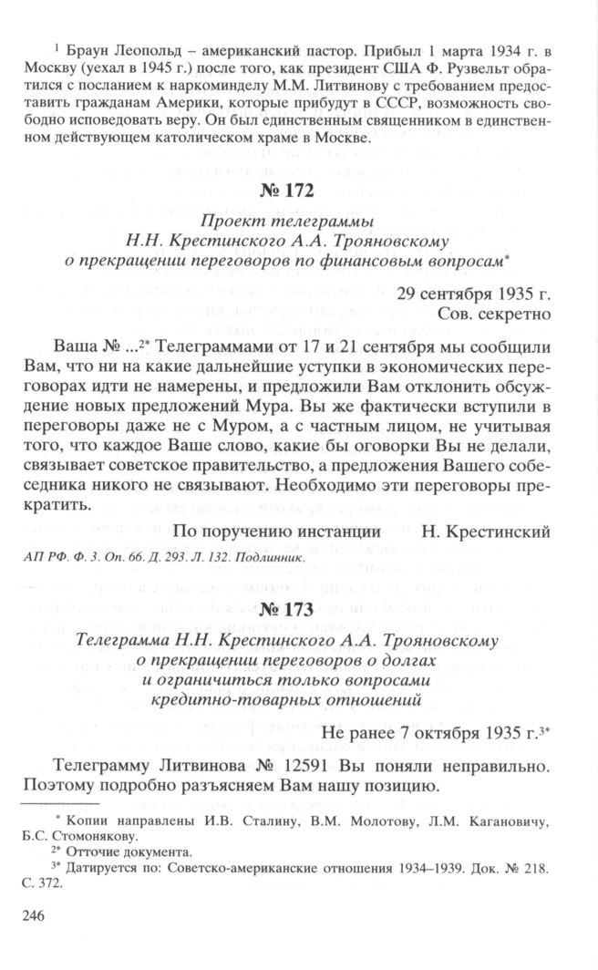 Проект телеграммы Н.Н. Крестинского А.А. Трояновскому о прекращении переговоров по финансовым вопросам. 29 сентября 1935 г. // АП РФ. Ф. 3. Oп. 66. Д. 293. Л. 132. Подлинник.