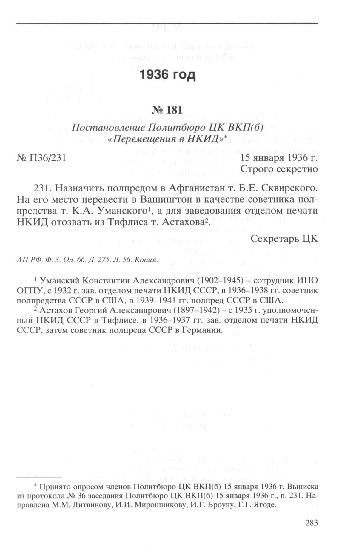 Постановление Политбюро ЦК ВКП(б) «Перемещения в НКИД». 15 января 1936 г.
