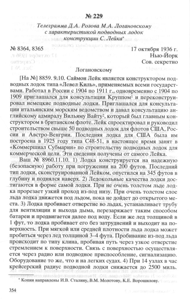 Телеграмма Д.А. Розова М.А. Логановскому с характеристикой подводных лодок конструкции С. Лейка. 17 октября 1936 г. // АП РФ. Ф. 3. Oп. 66. Д. 344. Л. 63-63 об. Заверенный дешифрант.