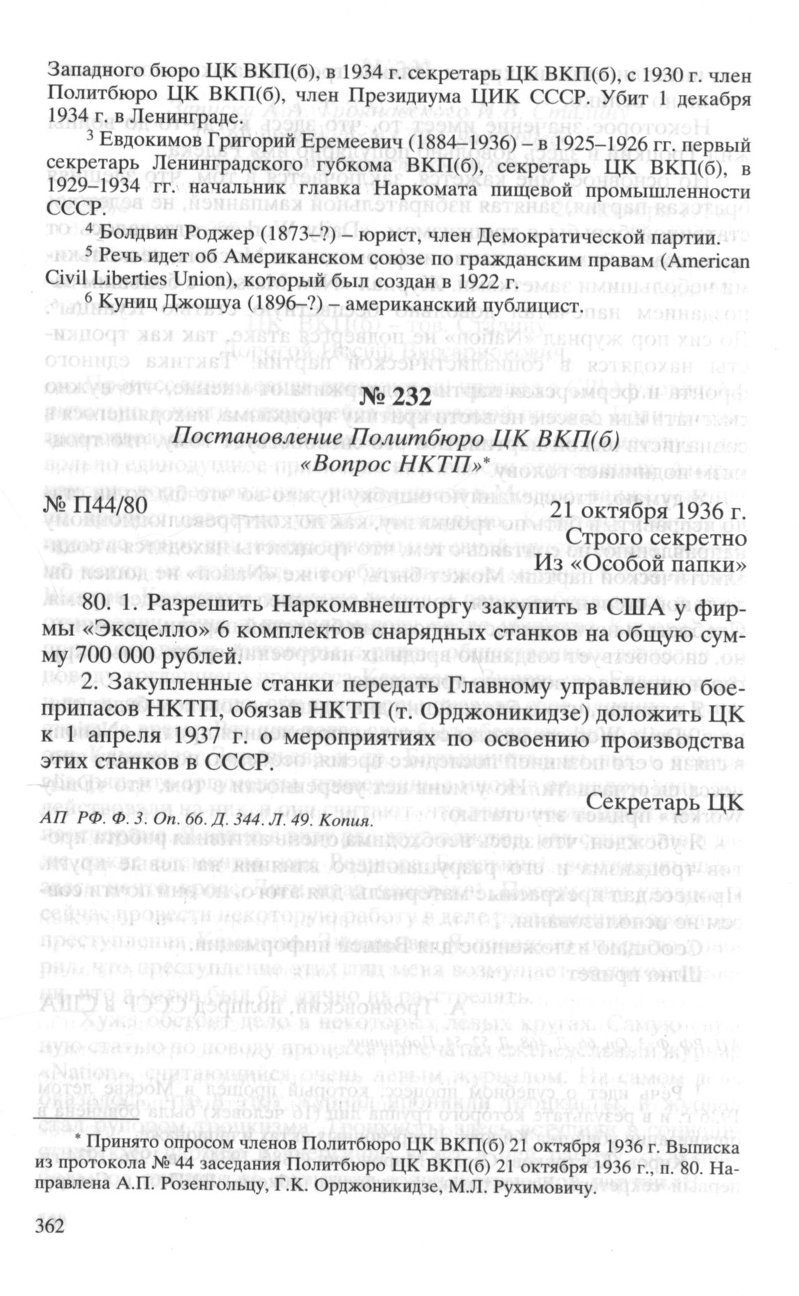 Постановление Политбюро ЦК ВКП(б) «Вопрос НКТП». 21 октября 1936 г. // АП РФ. Ф. 3. Oп. 66. Д. 344. Л. 49. Копия.