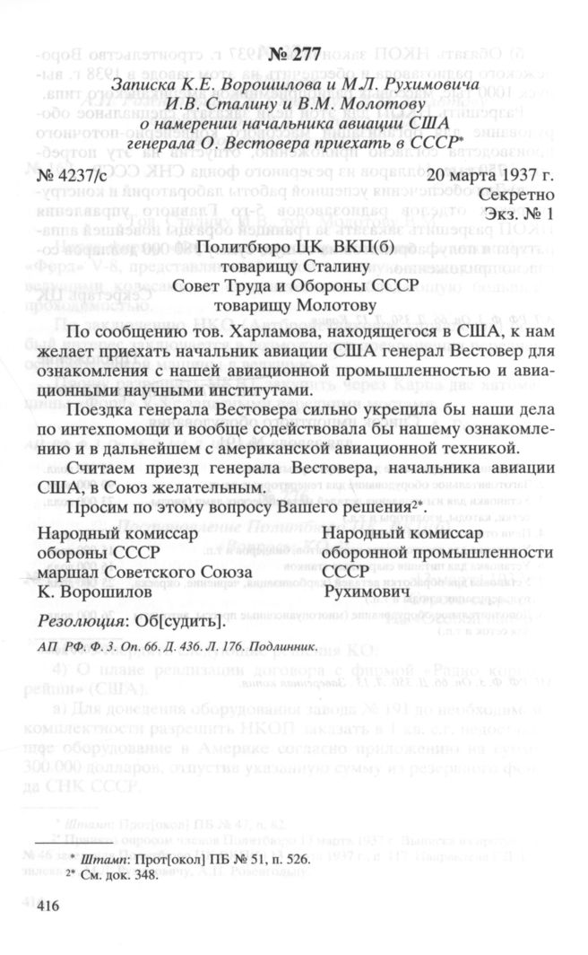 Записка К.Е. Ворошилова и М.Л. Рухимовича И.В. Сталину и В.М. Молотову о намерении начальника авиации США генерала О. Вестовера приехать в СССР. 20 марта 1937 г. // АП РФ. Ф. 3. Oп. 66. Д. 436. Л. 176. Подлинник.