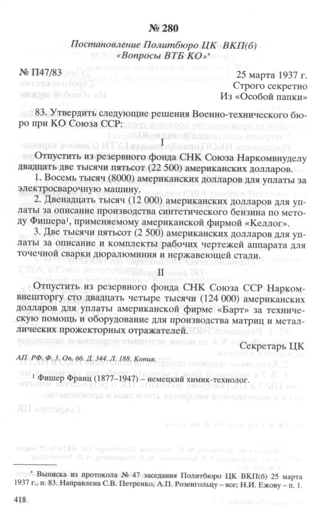 Постановление Политбюро ЦК ВКП(б) «Вопросы ВТБ КО». 25 марта 1937 г. // АП РФ. Ф. 3. Oп. 66. Д. 344. Л. 188. Копия.