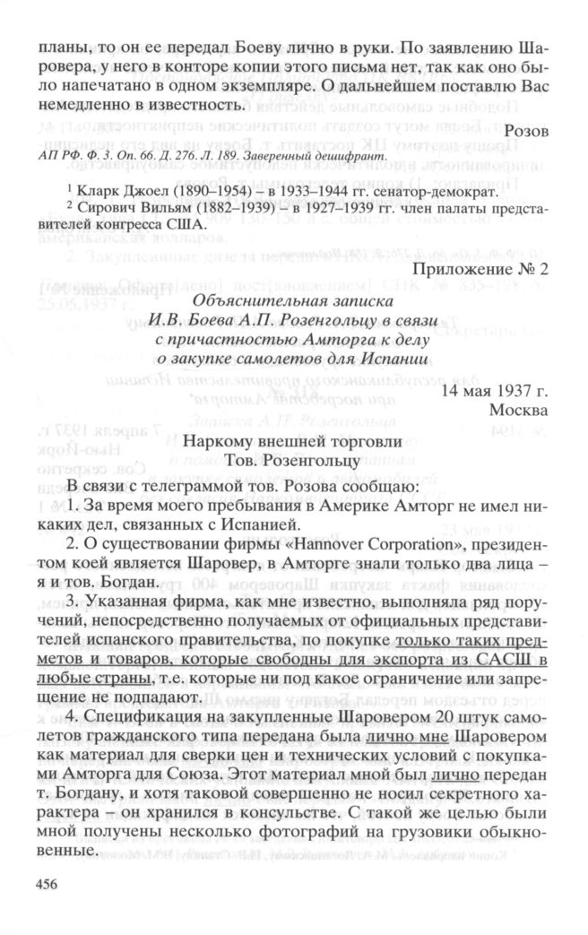 Приложение № 2. Объяснительная записка И.В. Боева А.П. Розенгольцу в связи с причастностью Амторга к делу о закупке самолетов для Испании. 14 мая 1937 г. // АП РФ. Ф. 3. Oп. 66. Д. 276. Л. 190. Заверенная копия.