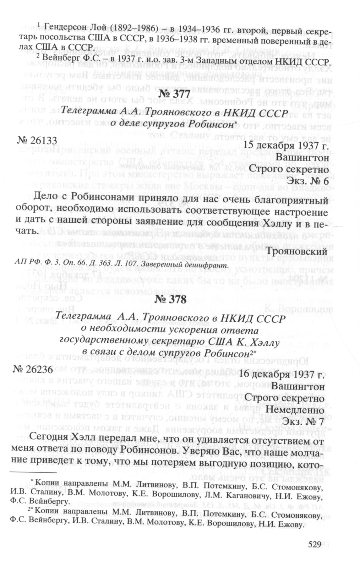 Телеграмма А.А. Трояновского в НКИД СССР о необходимости ускорения ответа государственному секретарю США К. Хэллу в связи с делом супругов Робинсон. 16 декабря 1937 г. // АП РФ. Ф. 3. Oп. 66. Д. 346. Л. 108. Заверенный деишфрант.