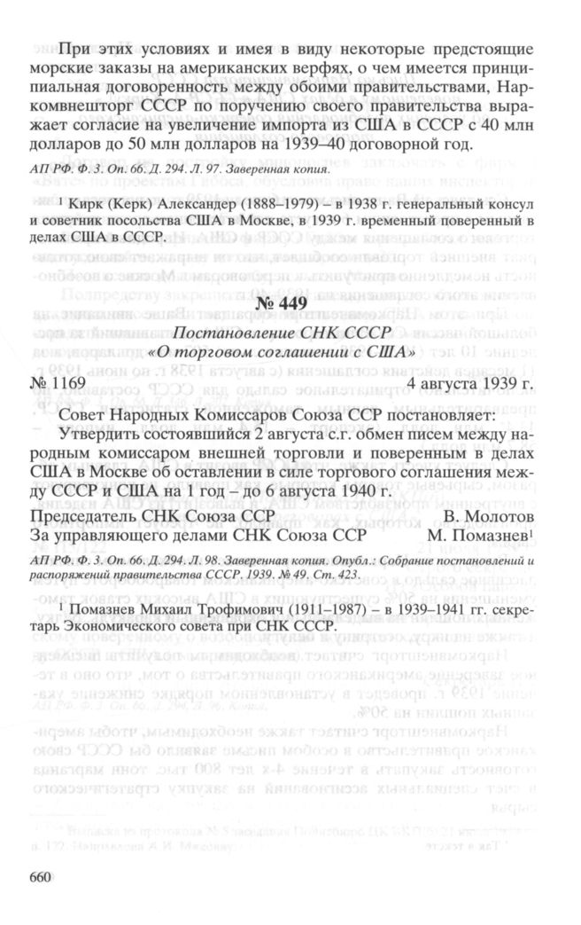 Постановление СНК СССР «О торговом соглашении с США». 4 августа 1939 г. // АП РФ. Ф. 3. Oп. 66. Д. 294. Л. 98. Заверенная копия.; Собрание постановлений и распоряжений правительства СССР. 1939. № 49. Cт. 423.
