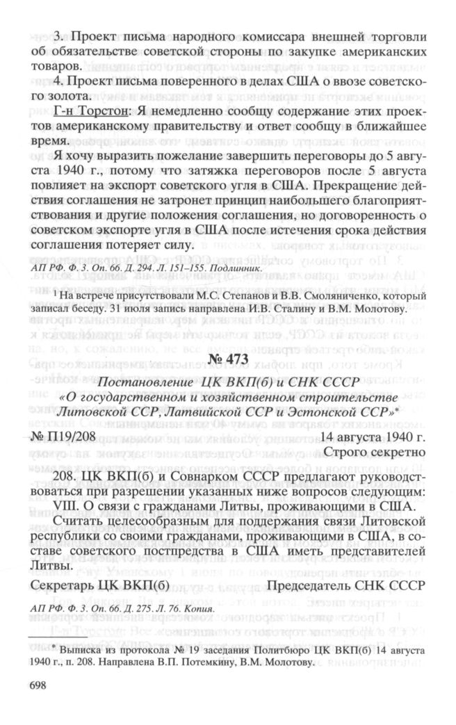 Постановление ЦК ВКП(б) и СНК СССР «О государственном и хозяйственном строительстве Литовской ССР, Латвийской ССР и Эстонской ССР». 14 августа 1940 г. // АП РФ. Ф. 3. Oп. 66. Д. 275. Л. 76. Копия.