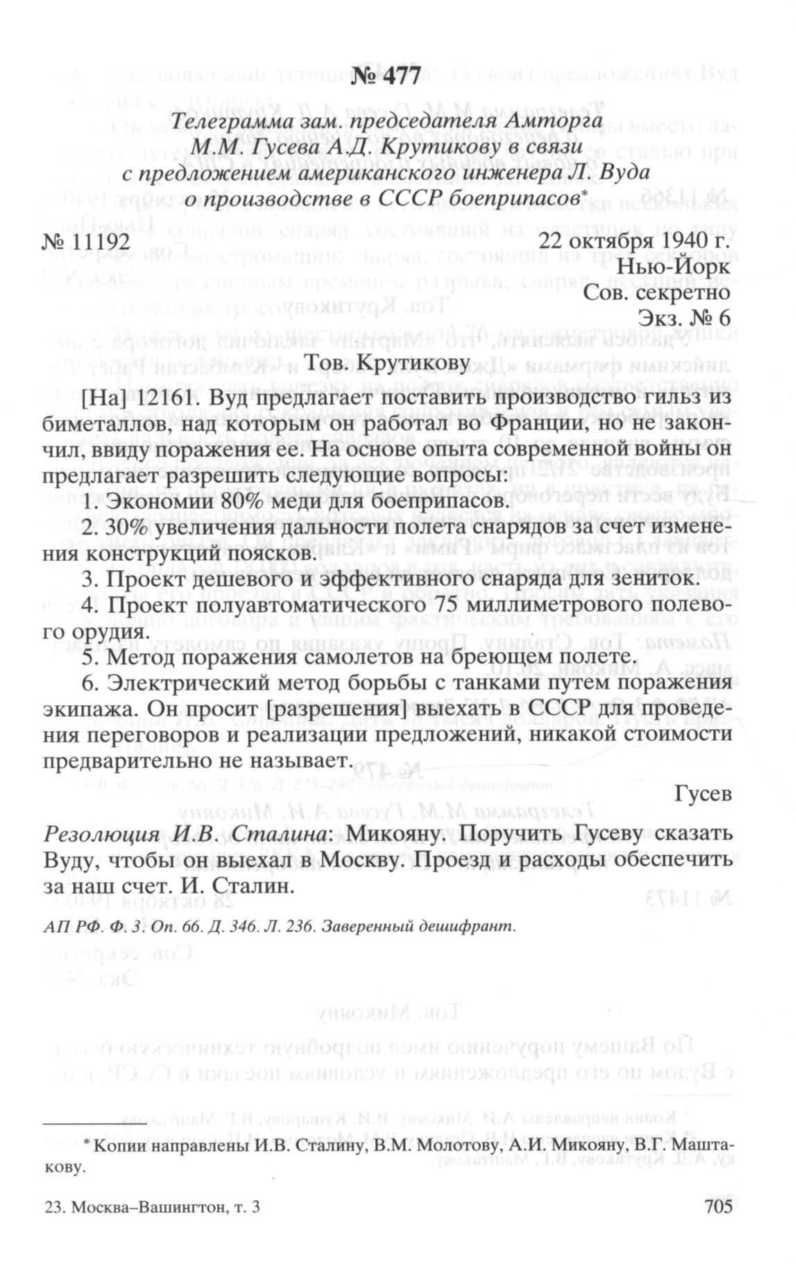 Телеграмма зам. председателя Амторга М.М. Гусева А.Д. Крутикову в связи с предложением американского инженера Л. Вуда о производстве в СССР боеприпасов. 22 октября 1940 г. // АП РФ. Ф. 3. Oп. 66. Д. 346. Л. 236. Заверенный дешифрант.