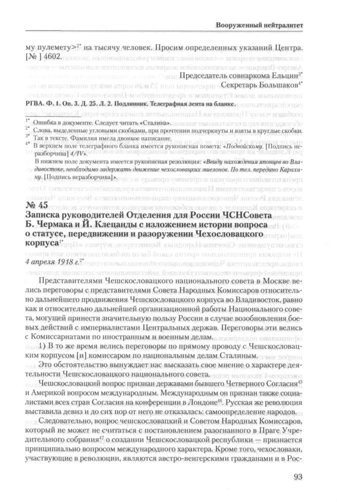 Записка руководителей Отделения для России ЧСНСовета Б. Чермака и Й. Клецанды с изложением истории вопроса о статусе, передвижении и разоружении Чехословацкого корпуса. 4 апреля 1918 г.