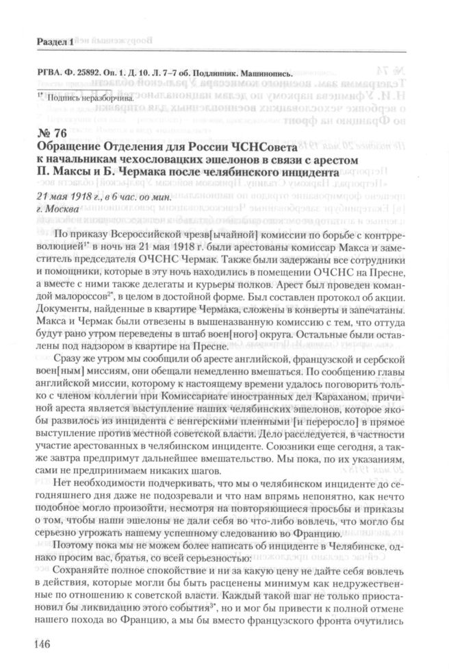 Обращение Отделения для России ЧСНСовета к начальникам чехословацких эшелонов в связи с арестом П. Максы и Б. Чермака после челябинского инцидента. 21 мая 1918 г.