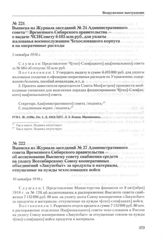 Выписка из Журнала заседаний № 27 Административного совета Временного Сибирского правительства - об ассигновании Высшему совету снабжения средств на уплату Всесибирскому Союзу кооперативных объединений «Закупсбыт» за продукты и материалы, отпущенные на нужды чехословацких войск. 10 октября 1918 г.