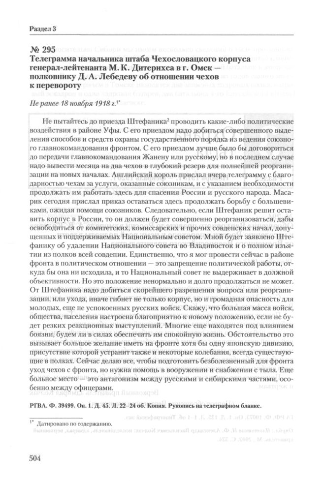 Телеграмма начальника штаба Чехословацкого корпуса генерала М.К. Дитерихса в г. Омск — полковнику Д.А. Лебедеву об отношении чехов к перевороту. Не ранее 18 ноября 1918 г. // РГВА. Ф. 39499. Oп. 1. Д. 45. Л. 22-24 об. Копия. Рукопись на телеграфном бланке.