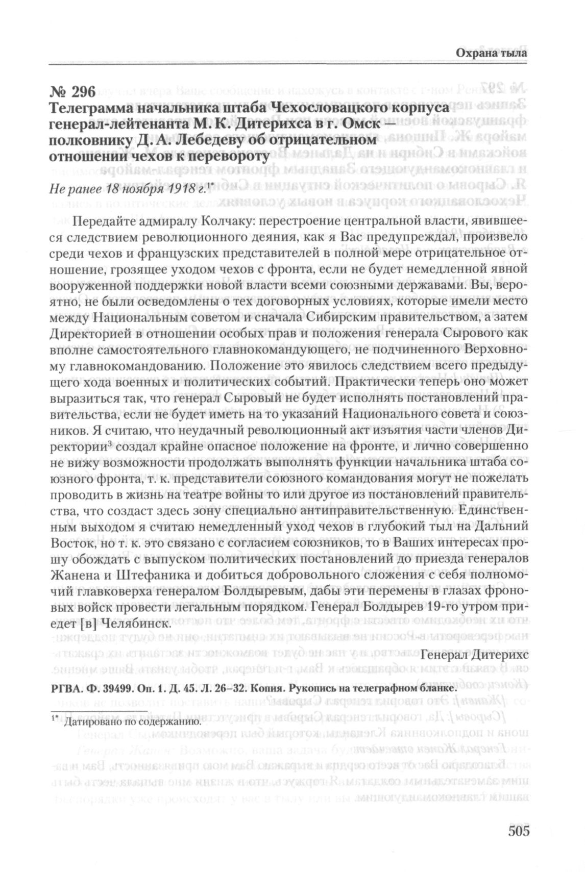Телеграмма начальника штаба Чехословацкого корпуса генерала М.К. Дитерихса в г. Омск — полковнику Д.А. Лебедеву об отрицательном отношении чехов к перевороту. Не ранее 18 ноября 1918 г. // РГВА. Ф. 39499. Oп. 1. Д. 45. Л. 26-32. Копия. Рукопись на телеграфном бланке.