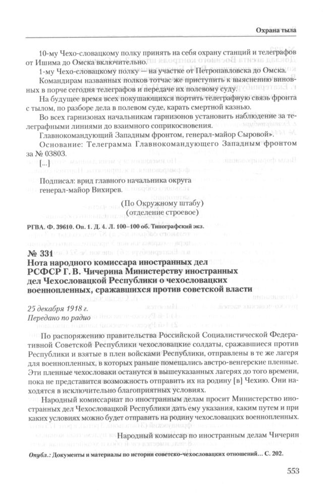 Нота народного комиссара иностранных дел РСФСР Г.В. Чичерина Министерству иностранных дел Чехословацкой Республики о чехословацких военнопленных, сражавшихся против советской власти. 25 декабря 1918 г. // Документы и материалы по истории советско-чехословацких отношений. Т. 1. Ноябрь 1917 г. — август 1922 г. М., 1973. С. 202.