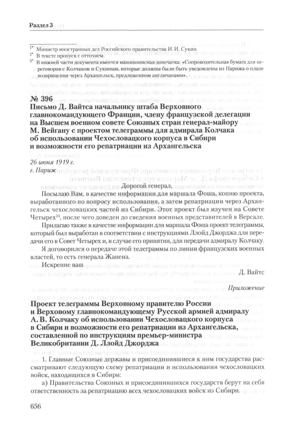 Письмо Д. Вайтса начальнику штаба Верховного главнокомандующего Франции, члену французской делегации на Высшем военном совете Союзных стран генерал-майору М. Вейгану с проектом телеграммы для адмирала Колчака об использовании Чехословацкого корпуса в Сибири и возможности его репатриации из Архангельска. 26 июня 1919 г. // РГВА. Ф. 198к. Oп. 17. Д. 545. Л. 166-174. Копия. Машинопись. Перевод с французского яз.
