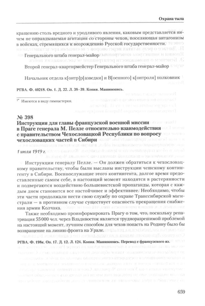 Инструкции для главы французской военной миссии в Праге генерала М. Пелле относительно взаимодействия с правительством Чехословацкой Республики по вопросу чехословацких частей в Сибири. 1 июля 1919 г. // РГВА. Ф. 198к. Оп. 17. Д. 12. Л. 124. Копия. Машинопись. Перевод с французского яз.