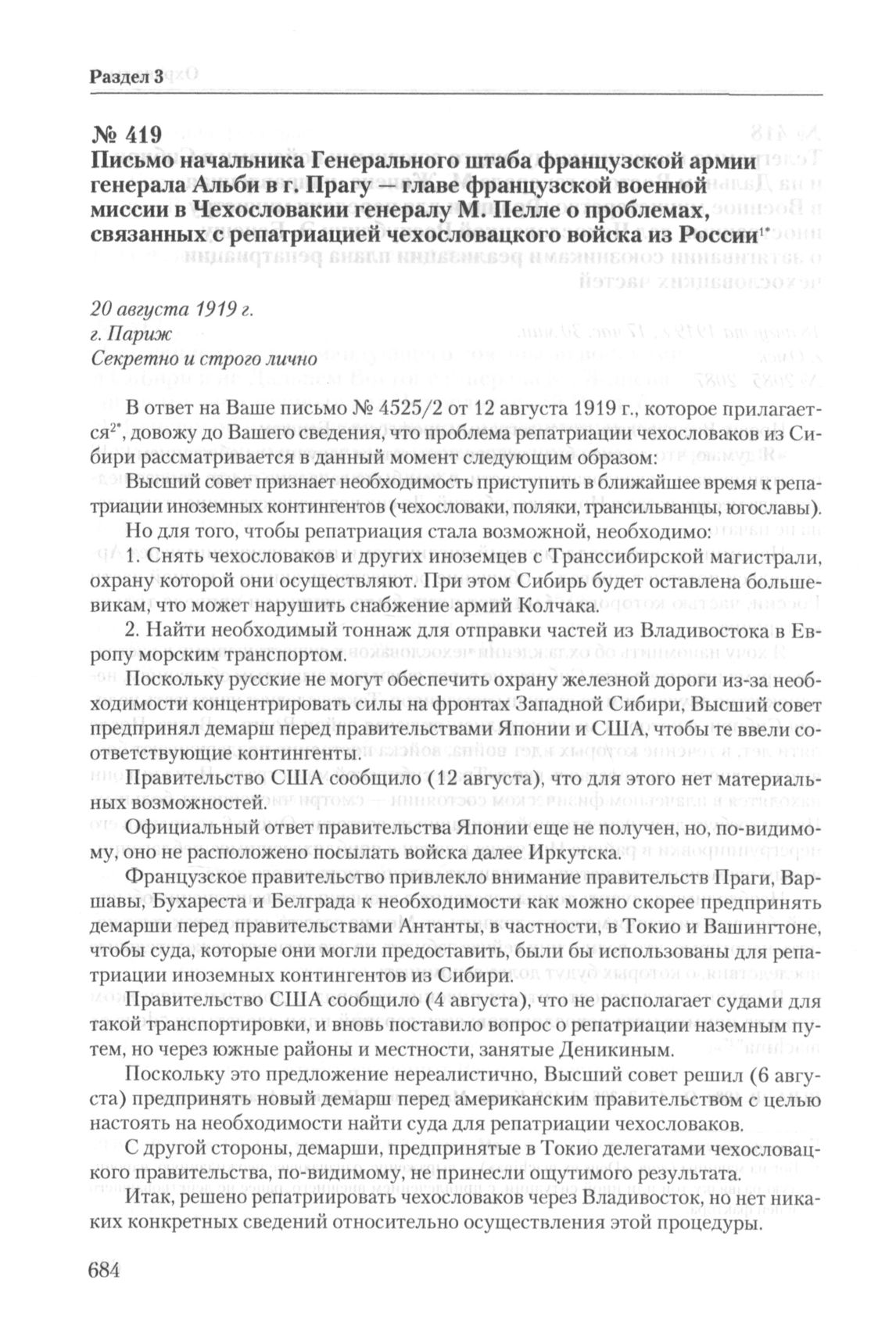 Письмо начальника Генерального штаба французской армии генерала Альби в г. Прагу — главе французской военной миссии в Чехословакии генералу М.-С.-Ж. Неллю о проблемах, связанных с репатриацией частей чехословацкого войска из России. 20 августа 1919 г. // РГВА. Ф. 198к. Оп. 17. Д. 488. Л. 120-121. Копия. Машинопись Перевод с французского яз.