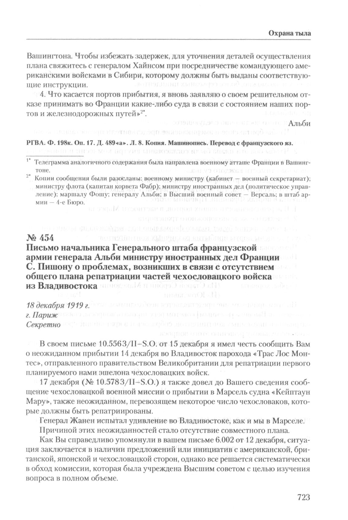 Письмо начальника Генерального штаба французской армии генерала Альби министру иностранных дел Франции С. Пишону о проблемах, возникших в связи с отсутствием общего плана репатриации частей чехословацкого войска из Владивостока. 18 декабря 1919 г. // РГВА. Ф. 198к. Oп. 17. Д. 489. Л. 412-414. Копия. Машинопись. Перевод с французского яз.