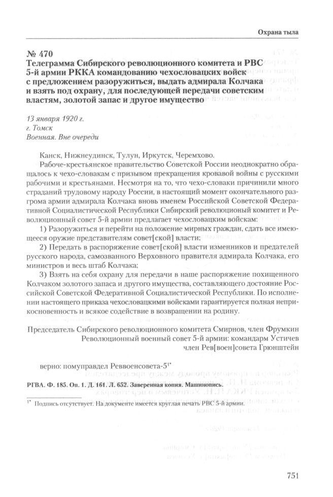 Телеграмма Сибирского революционного комитета и РВС 5-й армии РККА командованию чехословацких войск с предложением разоружиться, выдать адмирала Колчака и взять под охрану, для последующей передачи советским властям, золотой запас и другое имущество. 13 января 1920 г. // РГВА. Ф. 185. Oп. 1. Д. 161. Л. 652. Заверенная копия. Машинопись.