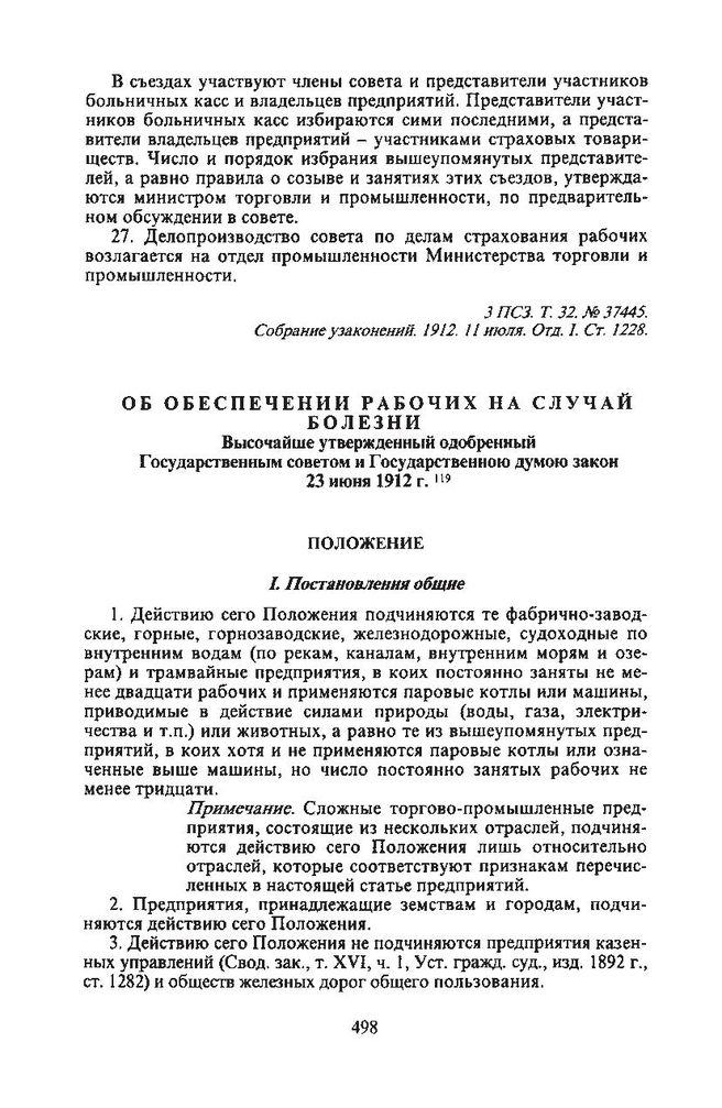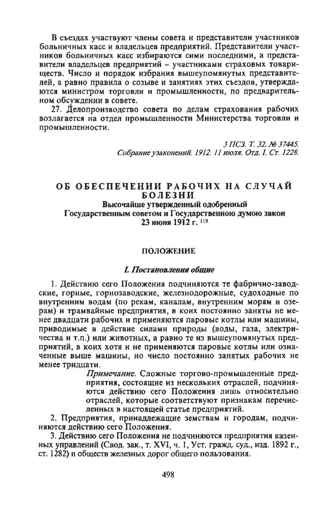 Об обеспечении рабочих на случай болезни : Высочайше утвержденный одобренный Государственным советом и Государственною думою закон 23 июня 1912 г. // 3 ПСЗ. Т. 32. № 37446. Собрание узаконений. 1912. 11 июля. Отд. I. Ст. 1229.