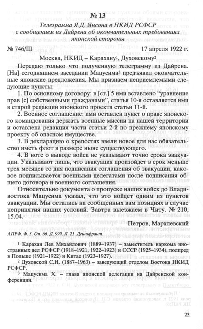 Телеграмма Я.Д. Янсона в НКИД РСФСР с сообщением из Дайрена об окончательных требованиях японской стороны. № 746/III. 17 апреля 1922 г. // АП РФ. Ф. 3. Oп. 66. Д. 999. Л. 21. Дешифрант.