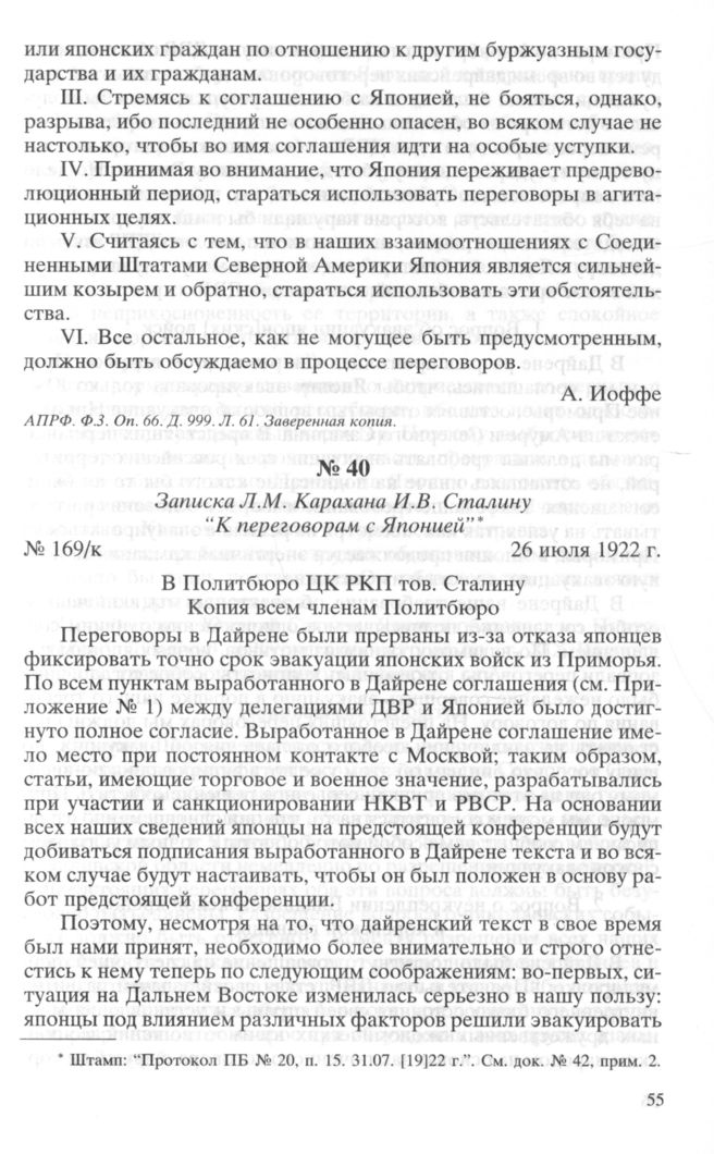 Записка Л.М. Карахана И.В. Сталину “К переговорам с Японией’’. № 169/к. 26 июля 1922 г. // АП РФ. Ф. 3. Oп. 66. Д. 999. Л. 64-68. Заверенная копия.