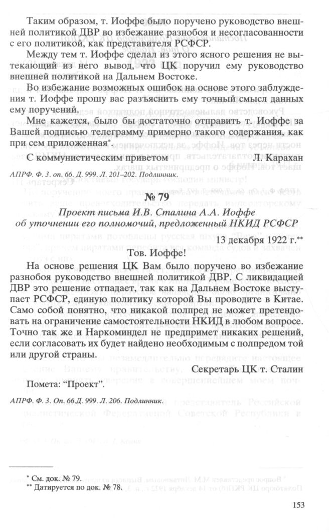 Проект письма И.В. Сталина А.А. Иоффе об уточнении его полномочий, предложенный НКИД РСФСР. 13 декабря 1922 г. // АП РФ. Ф. 3. Oп. 66. Д. 999. Л. 206. Подлинник.