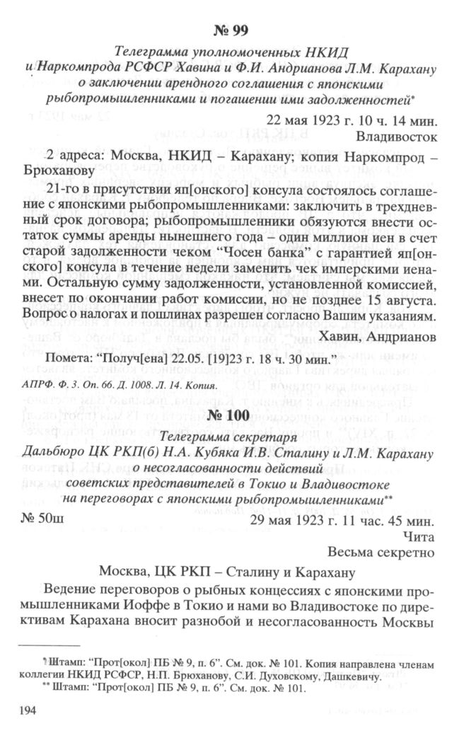 Телеграмма секретаря Дальбюро ЦК РКП(б) Н.А. Кубяка И.В. Сталину и Л.М. Карахану о несогласованности действий советских представителей в Токио и Владивостоке на переговорах с японскими рыбопромышленниками. № 50ш. Чита, 29 мая 1923 г. // АП РФ. Ф. 3. Oп. 66. Д. 1008. Л. 13. Дешифрант.