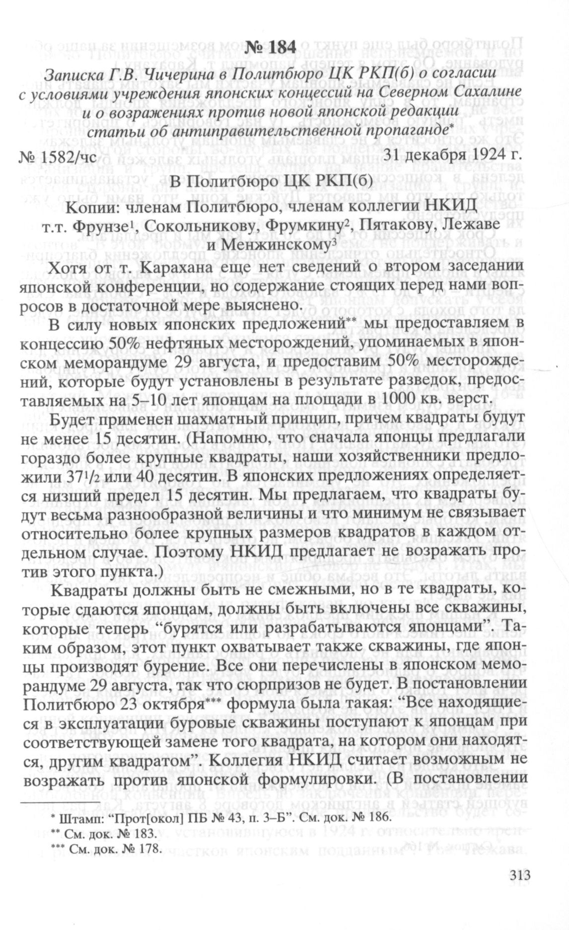 Записка Г.В. Чичерина в Политбюро ЦК РКП(б) о согласии с условиями учреждения японских концессий на Северном Сахалине и о возражениях против новой японской редакции статьи об антиправительственной пропаганде. № 1582/чс. 31 декабря 1924 г. // АП РФ. Ф. 3. Oп. 66. Д. 1001. Л. 3-7. Подлинник.