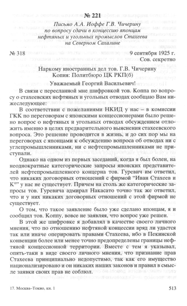 Письмо А.А. Иоффе Г.В. Чичерину по вопросу сдачи в концессию японцам нефтяных и угольных промыслов Стахеева на Северном Сахалине. № 318. 9 сентября 1925 г. // АП РФ. Ф. 3. Oп. 66. Д. 1001. Л. 71-73. Подлинник.