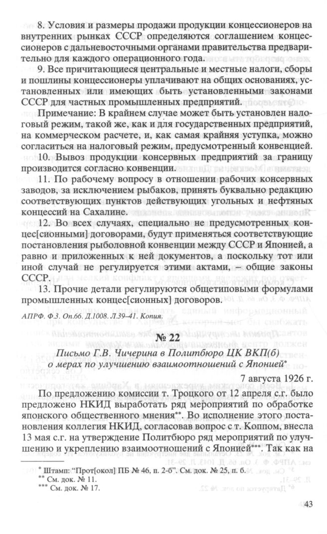 Письмо Г.В. Чичерина в Политбюро ЦК ВКП(б) о мерах по улучшению взаимоотношений с Японией. 7 августа 1926 г. // АП РФ. Ф. 3. Oп. 66. Д. 1043. Л. 23. Подлинник.