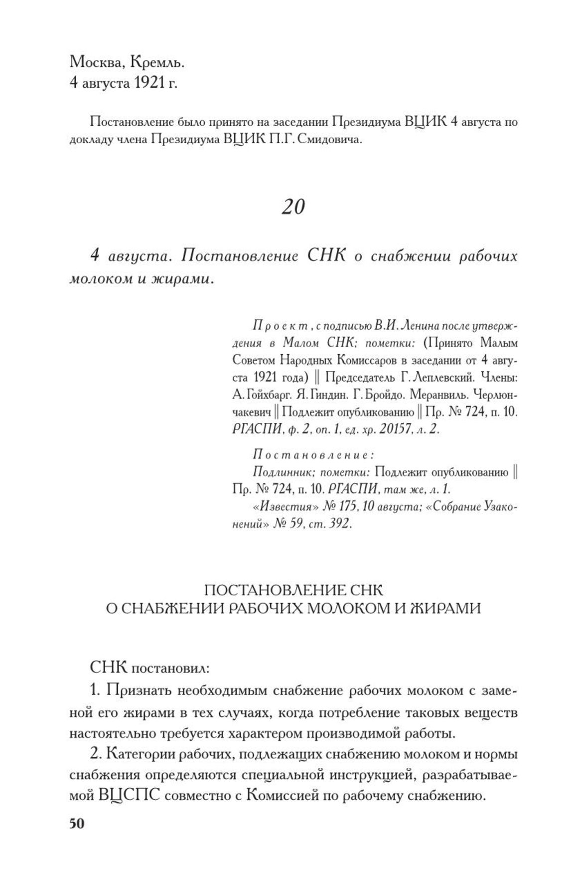 Постановление СНК о снабжении рабочих молоком и жирами. 4 августа 1921 г. // П р о е к т , с подписью В.И. Ленина после утверждения в Малом СНК; пометки: (Принято Малым Советом Народных Комиссаров в заседании от 4 августа 1921 года) || Председатель Г. Леплевский. Члены: А. Гойхбарг. Я. Гиндин. Г. Бройдо. Меранвиль. Черлюнчакевич || Подлежит опубликованию || Пр. № 724, п. 10. РГАСПИ, ф. 2, оп. 1, ед. хр. 20157, л. 2. П о с т а н о в л е н и е : Подлинник; пометки: Подлежит опубликованию || Пр. № 724, п. 10. РГАСПИ, там же, л. 1. «Известия» № 175, 10 августа; «Собрание Узаконений» № 59, ст. 392.