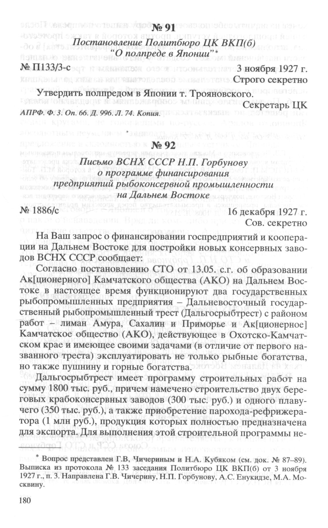 Постановление Политбюро ЦК ВКП(б) “О полпреде в Японии”. № П133/3-с. 3 ноября 1927 г. // АП РФ. Ф. 3. Oп. 66. Д. 996. Л. 74. Копия.