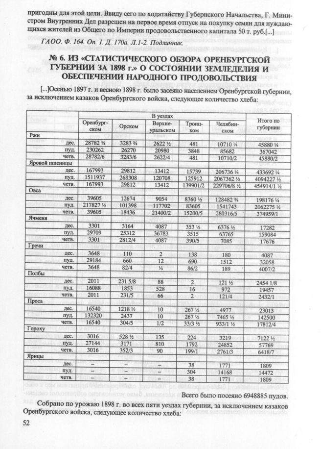 Из «Статистического обзора Оренбургской губернии за 1898 г.» о состоянии земледелия и обеспечении народного продовольстви