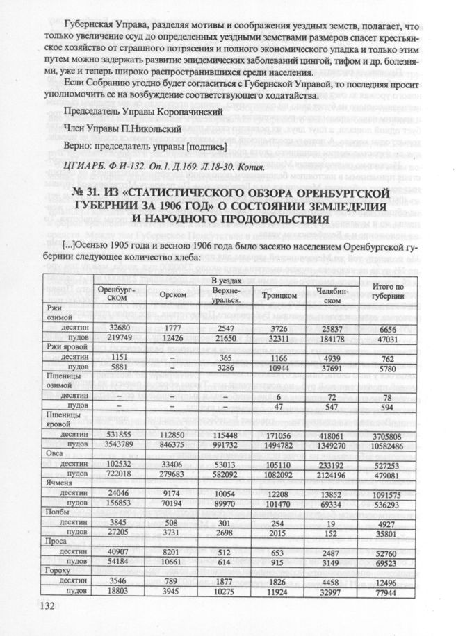 Из «Статистического обзора Оренбургской губернии за 1906 год» о состоянии земледелия и народного продовольствия // Статистический обзор Оренбургской губернии за 1906 год. Оренбург, 1907. С. 2-4.