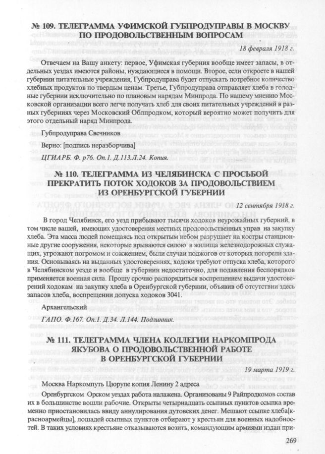 Телеграмма члена коллегии Наркомпрода Якубова о продовольственной работе в Оренбургской губернии, 19 марта 1919 г. // РЦХИДНИ. Ф. 5. Оп. 1. Д. 2720. Л. 15. Копия.