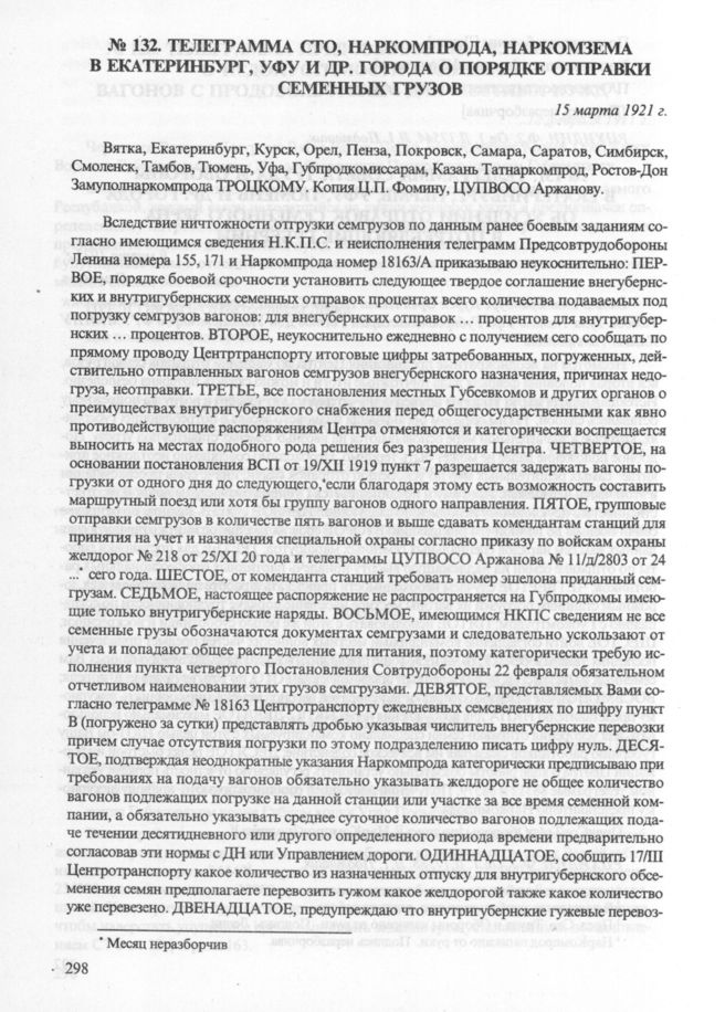 Телеграмма СТО, Наркомпрода, Наркомзема в Екатеринбург, Уфу и др. города о порядке отправки семенных грузов, 15 марта 1921 г.