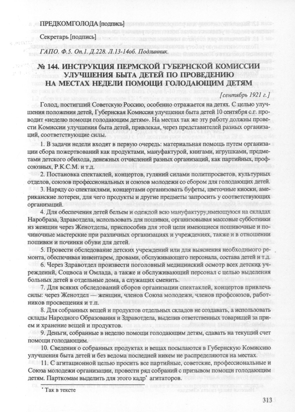 Инструкция Пермской Губернской Комиссии улучшения быта детей по проведению на местах недели помощи голодающим детям, сентябрь 1921 г. // ГАПО. Ф. р-5. Оп.1. Д.264. Л.27-27 об. Копия.
